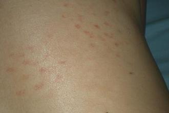 1、针头或绿豆大小的红色斑点,逐渐扩大,有的斑点相互分离,形成斑块。